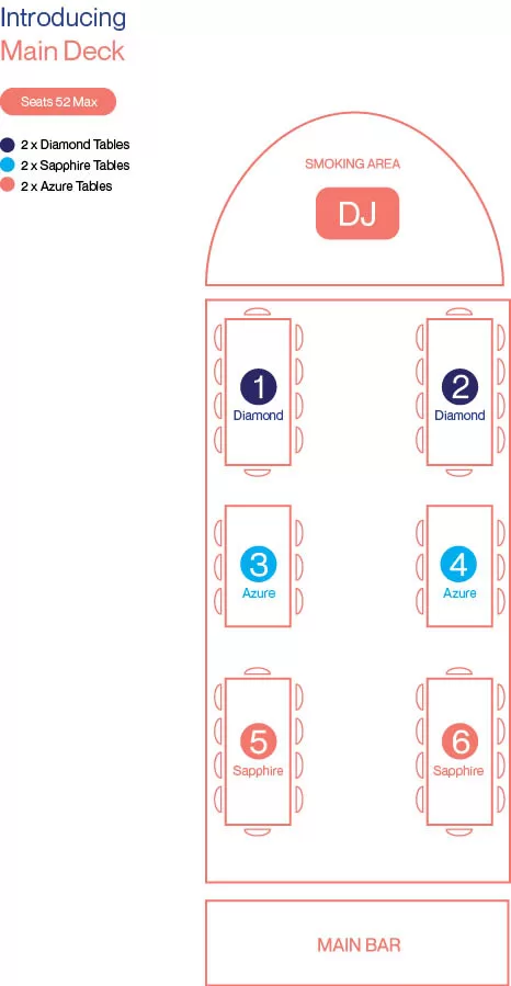 Guests can reserve tables for groups of 8 on the Middle Deck or top deck which only include